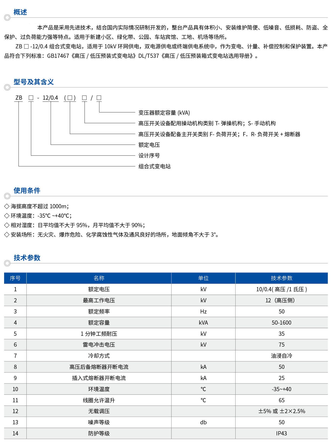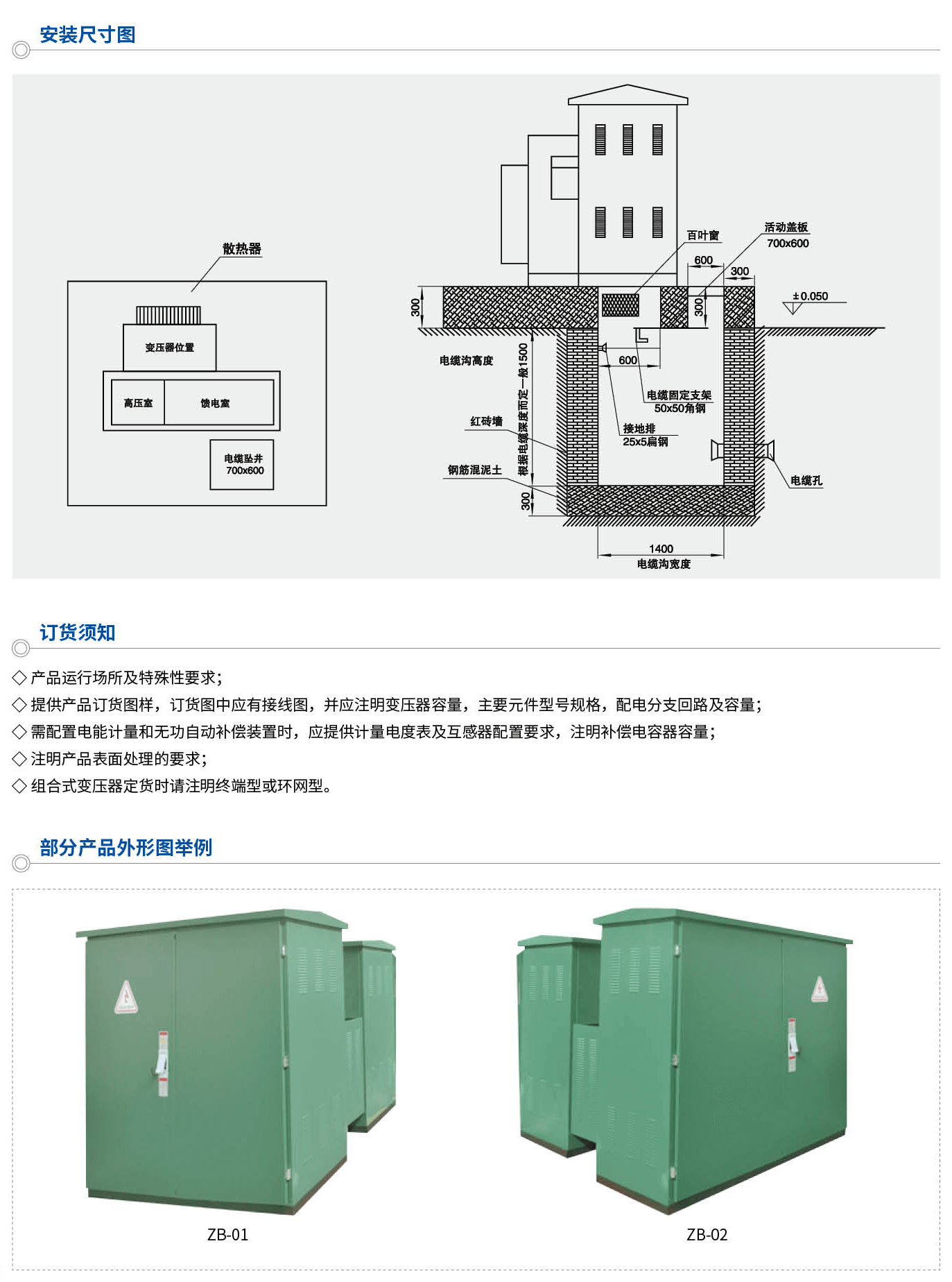 本產品是采用先進技術,結合國內實際情況研制開發的,整臺產品具有體積小、安裝維護簡便、低噪音、低損耗、防盜、全保護、過負荷能力強等特點。適用于新建小區、綠化帶、公園、車站賓館、工地、機場等場所。ZB口-12/0.4組合式變電站,適用于10kW環網供電,雙電源供電或終端供電系統中,作為變電、計量、補償控制和保護裝置。本產品符合下列標準:GB17467《高壓/低壓預裝式變電站》DLT537《高壓/低壓預裝箱式變電站選用導冊》。