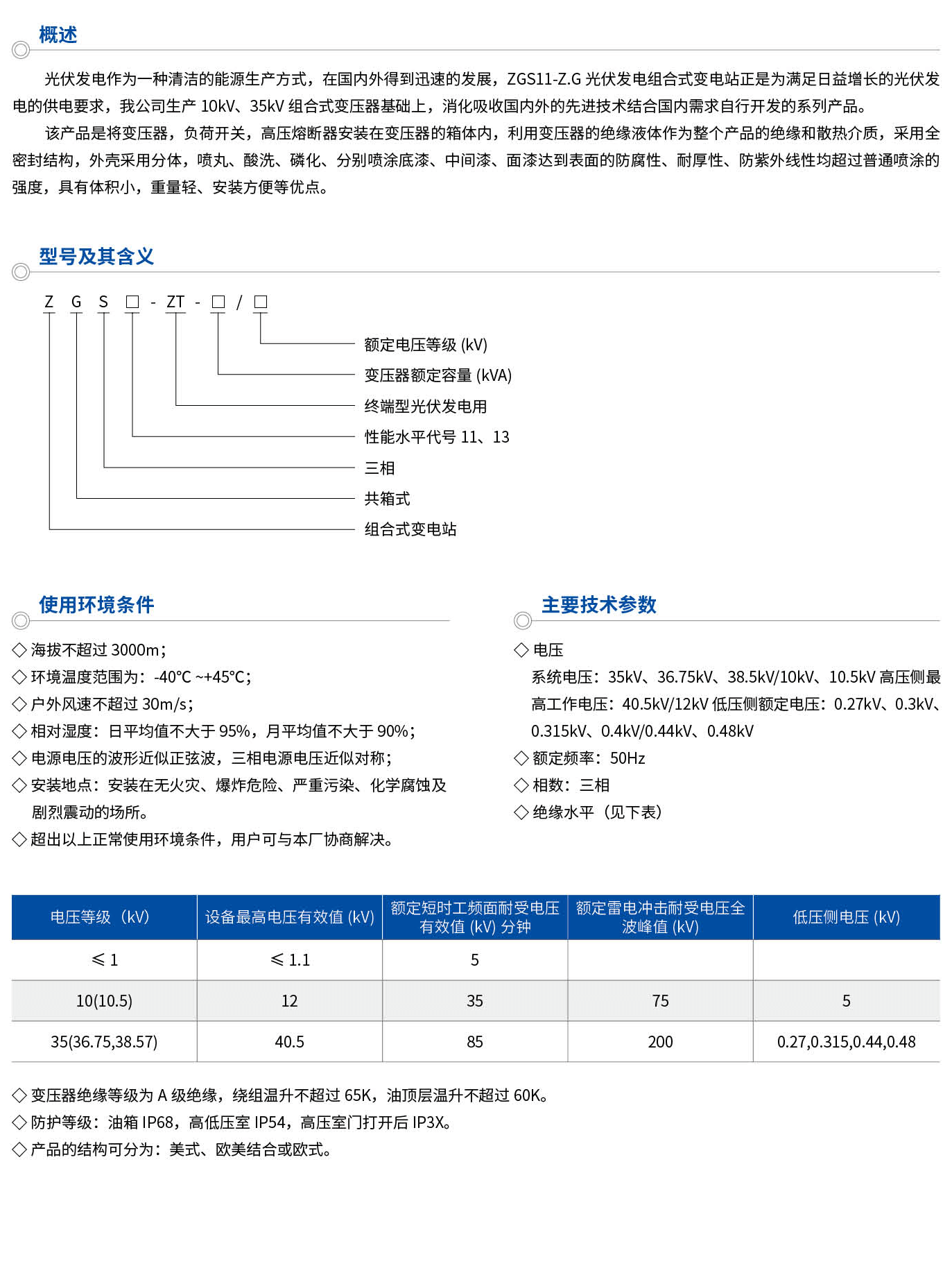 光伏發電作為一種清潔的能源生產方式,在國內外得到迅速的發展,ZGS11-Z.G光伏發電組合式變電站正是為滿足日益增長的光伏發電的供電要求,我公司生產10kV、35kV組合式變壓器基礎上,消化吸收國內外的先進技術結合國內需求自行開發的系列產品。該產品是將變壓器,負荷開關,高壓熔斷器安裝在變壓器的箱體內,利用變壓器的絕緣液體作為整個產品的絕緣和散熱介質,采用全密封結構,外殼采用分體,噴丸、酸洗、磷化、分別噴涂底漆、中間漆、面漆達到表面的防腐性、耐厚性、防紫外線性均超過普通噴涂的強度,具有體積小,重量輕、安裝方便等優點。