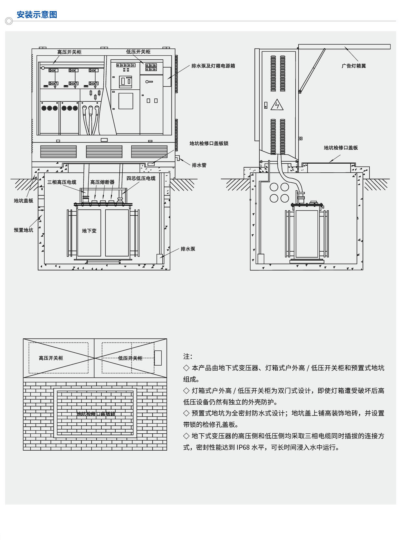 景觀式地埋變電站主要由安裝在地下的地下式變壓器(含預制式地坑)和安裝在地上的戶外廣告燈箱式高低壓開關設備兩部分組成。其中,地下式變壓器是一種帶有高壓熔斷器保護,能夠一段時間內侵沒入水中運行的新型配電變壓器,在我國的機場、高速公路、橋梁、隧道等場所已經有了較為廣泛的使用;戶外燈箱式高低壓開關設備的內部為戶外高低壓配電柜,箱體外側為廣告燈箱。可以根據周圍環境、用戶要求設計廣告面的內容。整個產品占地面積小,美觀大方,不但能與周圍環境高度協調,還能實現廣告作用。