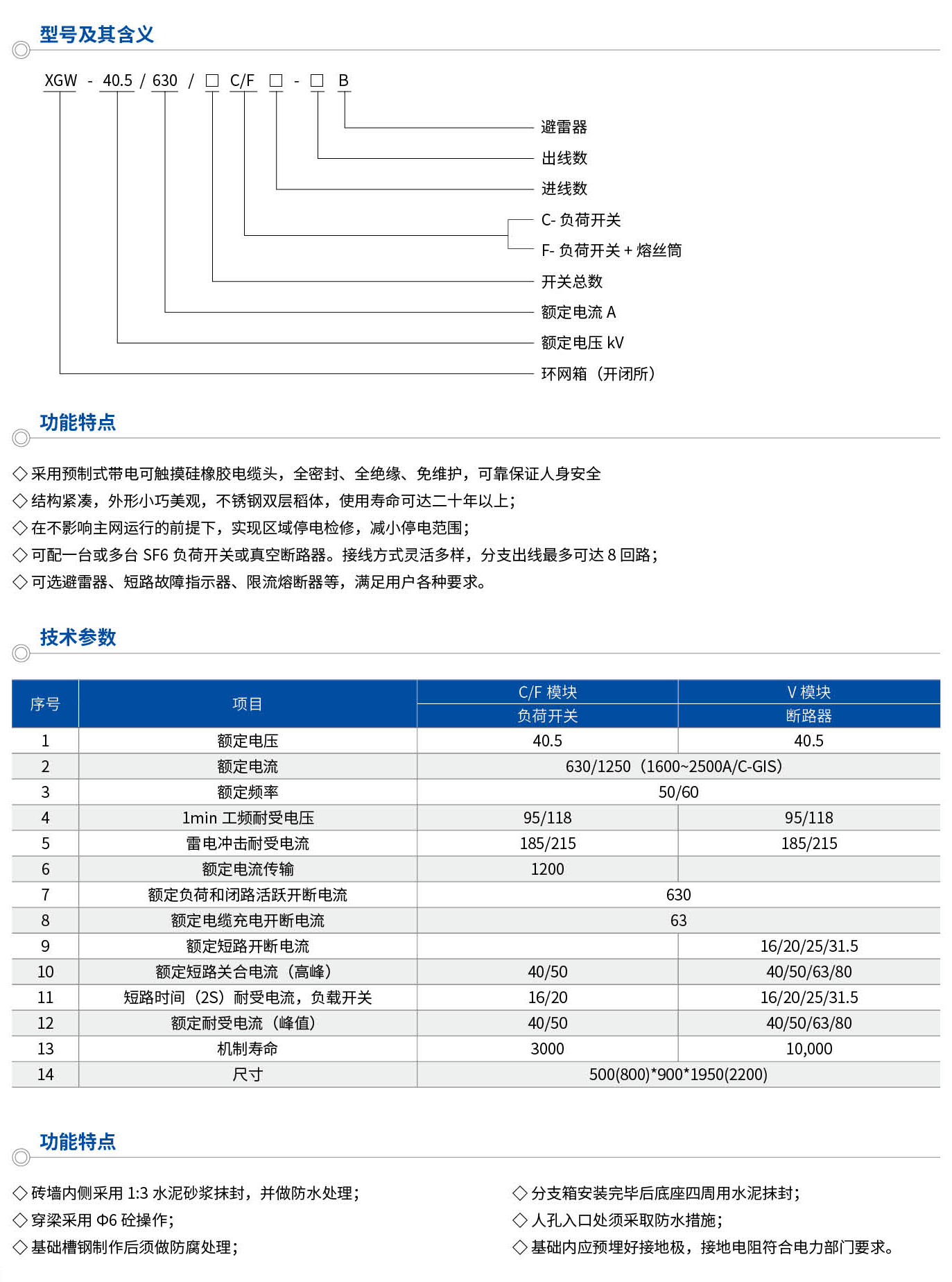 功能特點:采用預(yù)制式帶電可觸摸硅橡膠電纜頭,全密封、全絕緣、免維護,可靠保證人身安全.結(jié)構(gòu)緊湊,外形小巧美觀,不銹鋼雙層稻體,使用壽命可達二十年以上;在不影響主網(wǎng)運行的前提下,實現(xiàn)區(qū)域停電檢修,減小停電范圍;可配一臺或多臺SF6負荷開關(guān)或真空斷路器。接線方式靈活多樣,分支出線可多達8回路;可選避雷器、短路故障指示器、限流熔斷器等,滿足用戶各種要求。