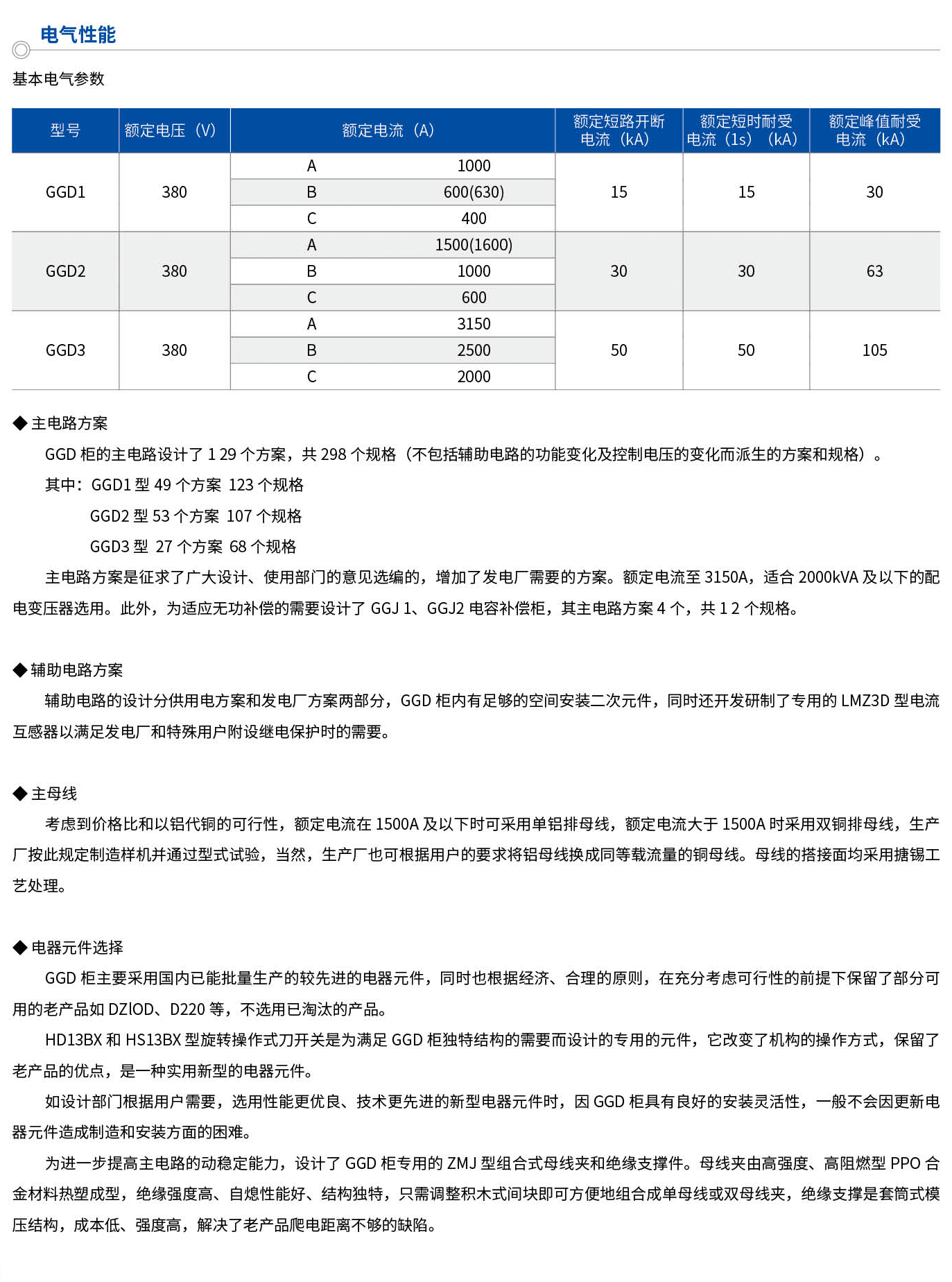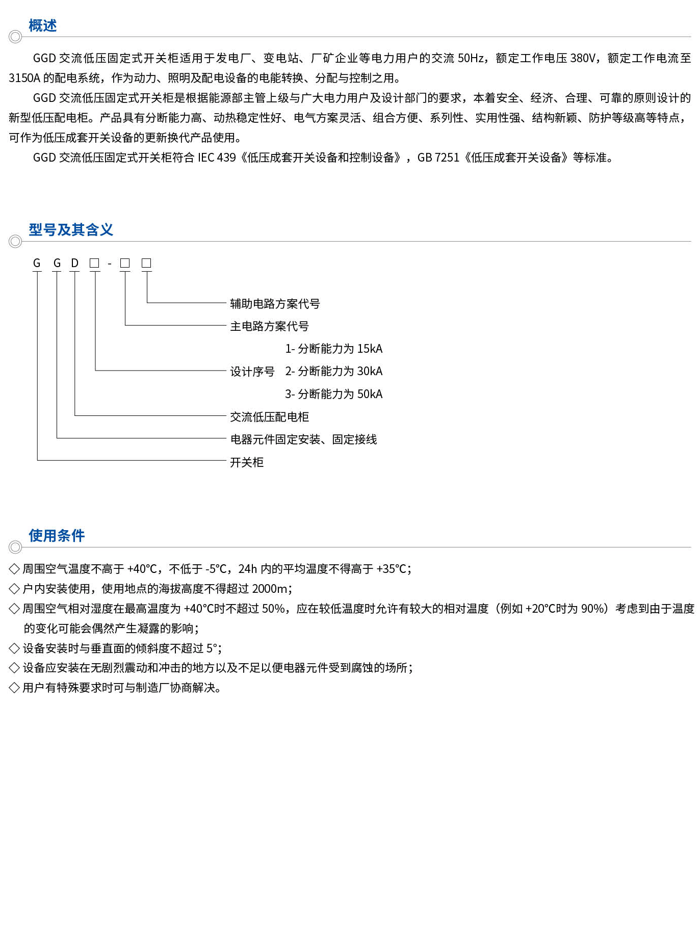 GGD交流低壓固定式開關(guān)柜適用于發(fā)電廠、變電站、廠礦企業(yè)等電力用戶的交流50HZ,額定工作電壓380V,額定工作電流至3150A的配電系統(tǒng),作為動力、照明及配電設(shè)備的電能轉(zhuǎn)換、分配與控制之用。GGD交流低壓固定式開關(guān)柜是根據(jù)能源部主管上級與廣大電力用戶及設(shè)計部門的要求,本著安全、經(jīng)濟、合理、可靠的原則設(shè)計的新型低壓配電柜。產(chǎn)品具有分斷能力高、動熱穩(wěn)定性好、電氣方案靈活、組合方便、系列性、實用性強、結(jié)構(gòu)新穎、防護等級高等特點,可作為低壓成套開關(guān)設(shè)備的更新?lián)Q代產(chǎn)品使用。GGD交流低壓固定式開關(guān)柜符合EC439《低壓成套開關(guān)設(shè)備和控制設(shè)備》,GB7251《低壓成套開關(guān)設(shè)備》等標準。